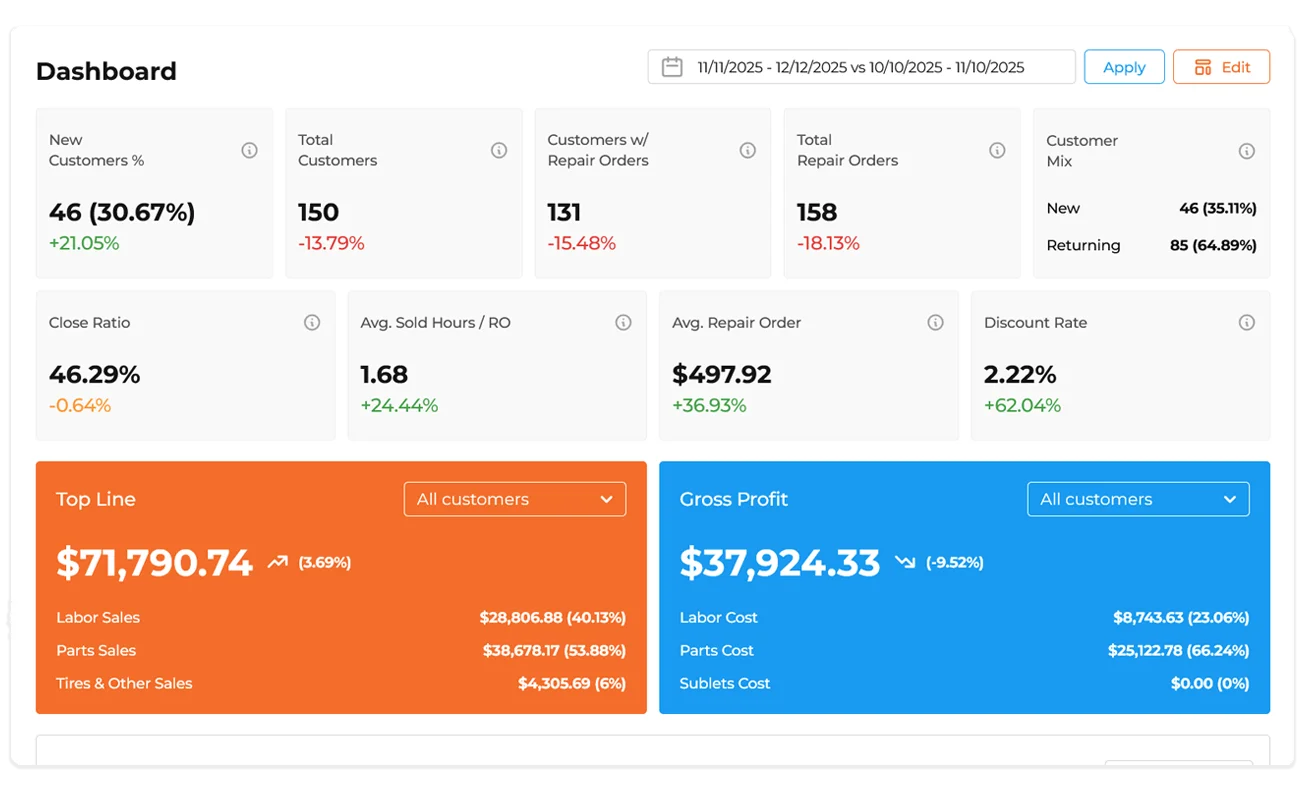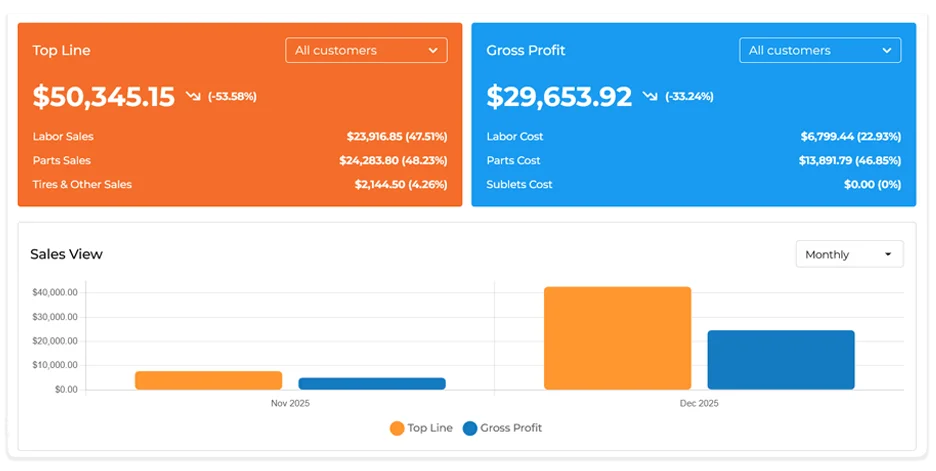 Tired of manually calculating your KPI’s?  View all your important shop statistics to run your shop by the numbers.  Don’t guess about your parts margins, productivity or effective labor rates.  Quickly access the numbers for your shop and make informed decisions.