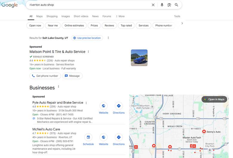- The search has clear local service intent (auto repair near me, closest tire shop, etc.)