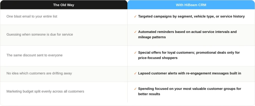 Customer segmentation means splitting your customers into groups based on what they have in common. Things like how often they visit, what they drive, and why they come to you. Once you know those groups, you can talk to each one in a way that actually makes sense to them. HiBeam CRM is built to make this easy, even if you do not have a marketing team.