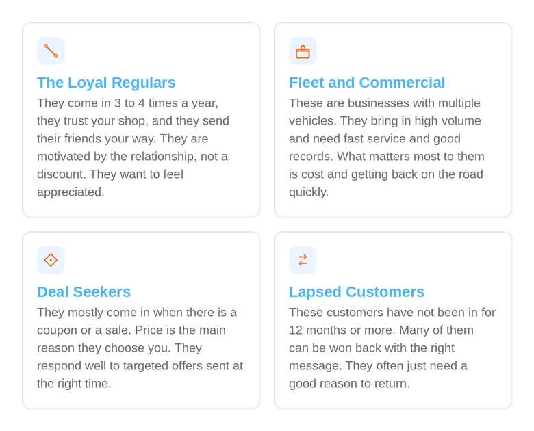 For a shop owner, understanding what motivates customers means knowing who responds to a discount on an oil change and who just wants to know their car is in good hands. One group wants a deal. The other wants to feel confident. Sending them the same message means neither one gets what they need to hear.
