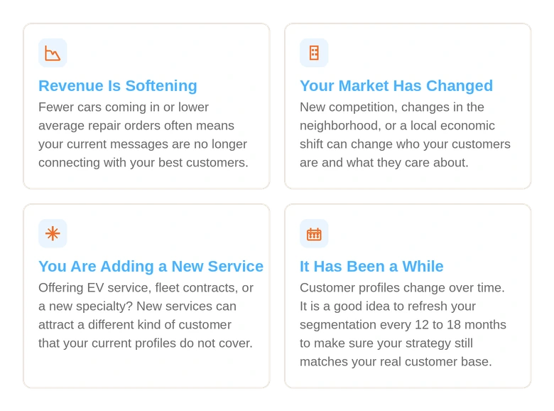 Customer habits change over time. Most shop owners wait too long before updating their segmentation strategy. Here are some clear signs it is time to take a fresh look: